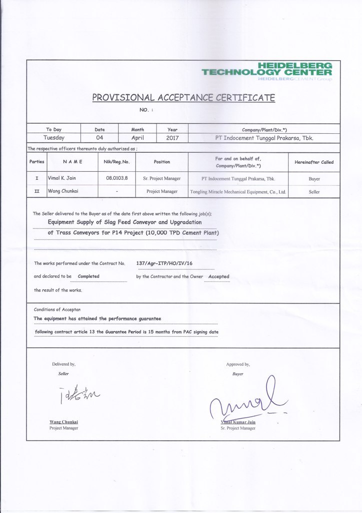 2017年4月在印尼PT Indocement Tunggal Prakarsa, Tbk項目的現(xiàn)場成功試車運行并且得到業(yè)主方的認可。與同年5月,我公司收到了業(yè)主方和安裝方現(xiàn)場簽署的現(xiàn)場合格驗收證明,證明我公司供貨的皮帶機設(shè)備各方面性能運行良好。